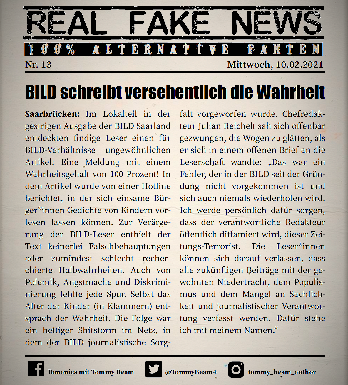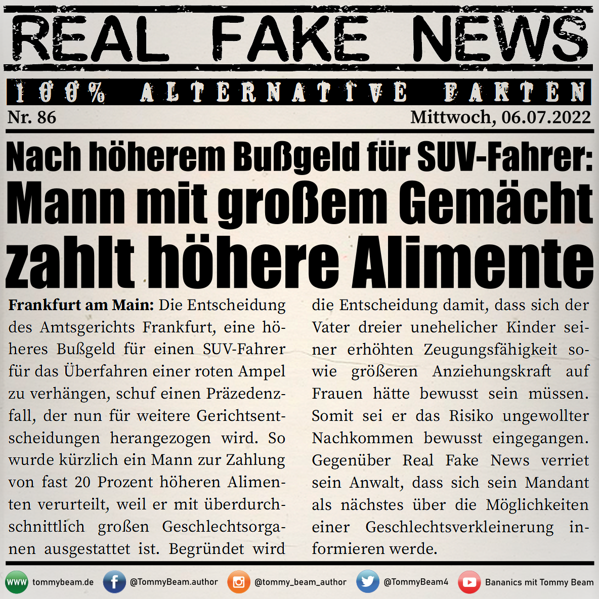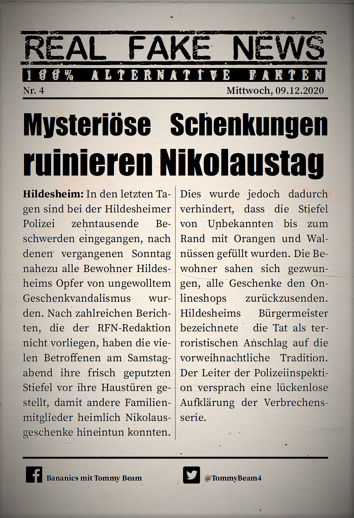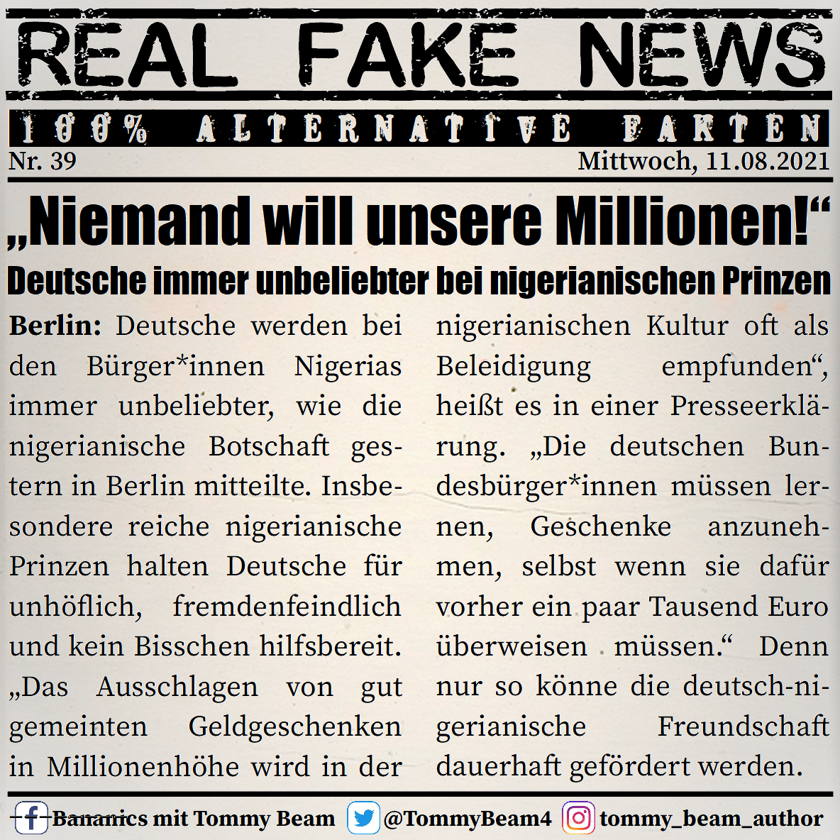 Bei der Rubrik ,,Real Fake News“ handelt es sich um Satire. Die geschilderten Behauptungen müssen nicht der Wahrheit entsprechen und spiegeln nicht die Meinung des Autoren wieder.